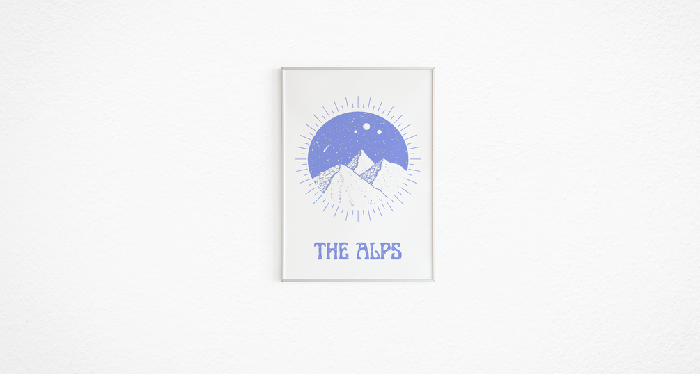 These three purple posters showcase different wonders. The first poster portrays an eye above a tree, perhaps hinting at the beauty and watchfulness of nature. The second poster depicts a majestic mountain range, likely referencing the grandeur and power of the Alps. Finally, the third poster showcases a serene moon above a tree, imbuing a sense of calm and tranquility. Together, these posters offer a variety of perspectives on the beauty and majesty of the natural world in a unique way.